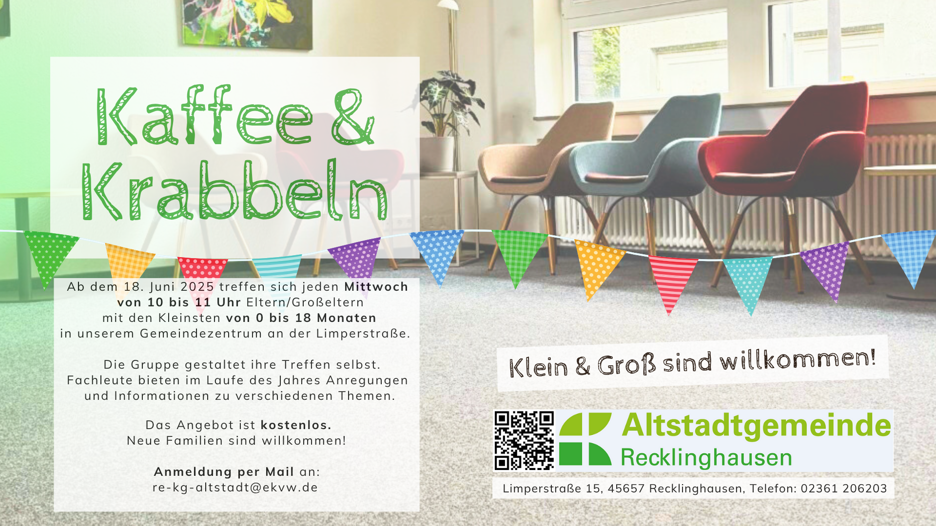 Jeden Mittwoch treffen sich Eltern mit ihren Kindern von 0 bis 18 Monaten von 10 bis 11.30 Uhr in unserem Gemeindezentrum zum Austausch und Spielen.